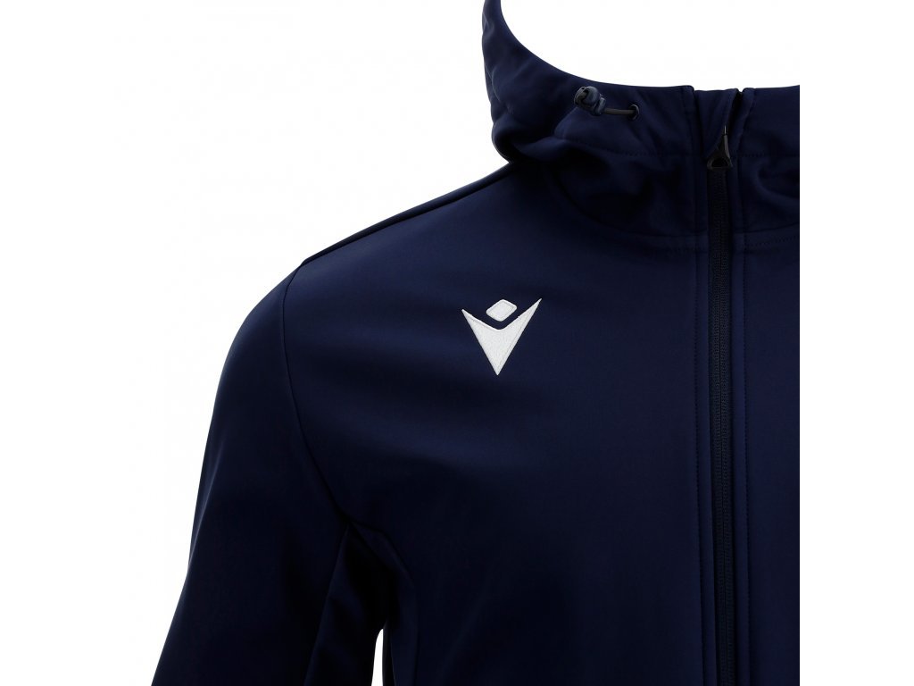 Těžká bunda ze softshellové, větruodolné tkaniny. Obrácený centrální zip po celé délce z nylonu s automatickým zámkem. Boční kapsy se zapínáním na zip. Stahovací šňůrky na kapuci a spodní části pro úpravu střihu. Manžety rukávů z lycry se zapínáním na suchý zip a knoflík. Barevné vsadky na bocích a spodním okraji rukávů.