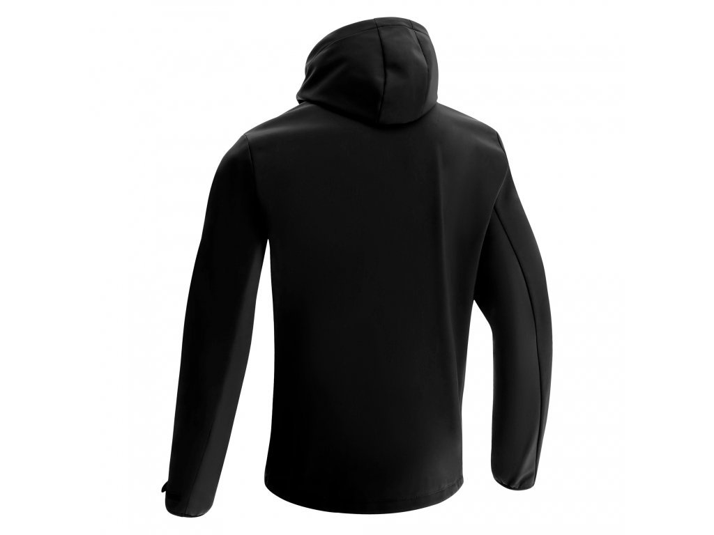 Těžká bunda ze softshellové, větruodolné tkaniny. Obrácený centrální zip po celé délce z nylonu s automatickým zámkem. Boční kapsy se zapínáním na zip. Stahovací šňůrky na kapuci a spodní části pro úpravu střihu. Manžety rukávů z lycry se zapínáním na suchý zip a knoflík. Barevné vsadky na bocích a spodním okraji rukávů.