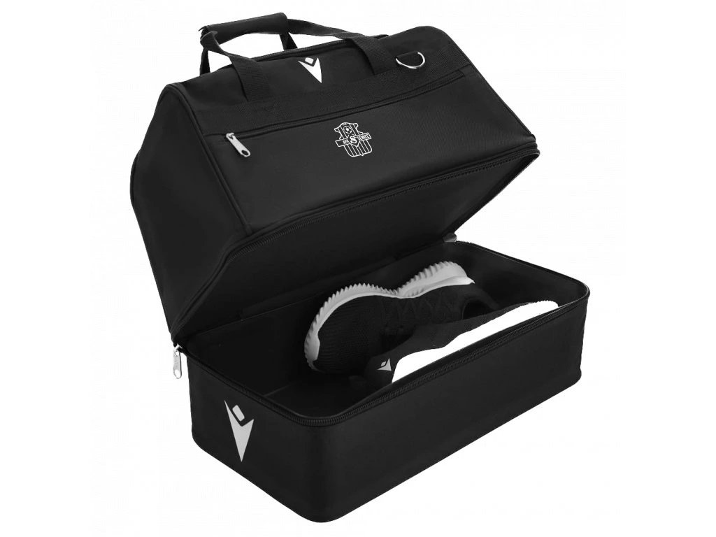 Taška s velkou centrální přihrádkou a širokým horním otvorem pro plné využití veškerého dostupného prostoru. Je vybavena velkou přední kapsou se zapínáním na zip a pevným skořepinovým dnem ideálním pro nošení bot. Dvě ucha s omotávkou na suchý zip a ramenní popruh pro přenášení. K dispozici ve velké a střední velikosti.